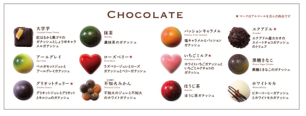 抹茶、ホワイトモカ、ほうじ茶、アールグレイ、グリオットチェリー★、大学芋、いちごミルク★、エクアドル★
