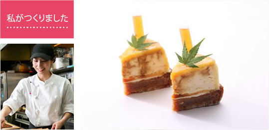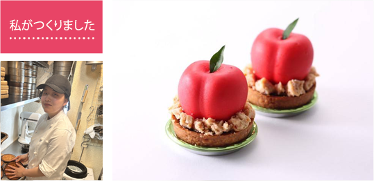 キャラメリゼしたりんごが入ったタルトの上に大きなりんごムースが乗っています。中にもりんごの果肉の入ったパパロアを忍ばせました
