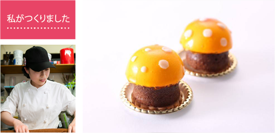 チョコレート味のマドレーヌ生地の上にベリージュレの入ったチーズムースの黄色いキノコの1UPケーキです