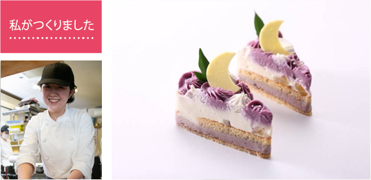 ゴロゴロ食感のさつまいもの甘露煮が入った和三盆のムースと紫芋のムースの2層仕立て紫芋の生クリームをトッピングしています。