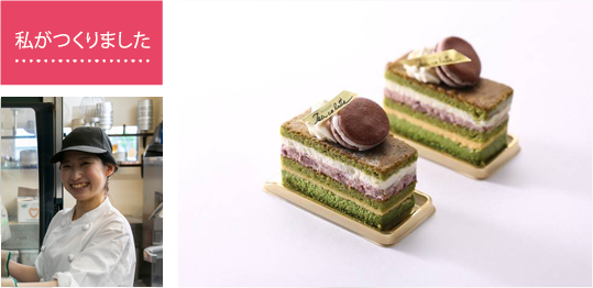 宇治抹茶を使ったムースとパッションクリーム, 粒あんクリーム、マスカルポーネのクリームを抹茶のカステラでサンド!生どら焼きをケーキ屋さん風にアレンジしたケーキです。