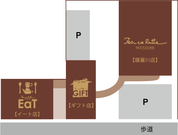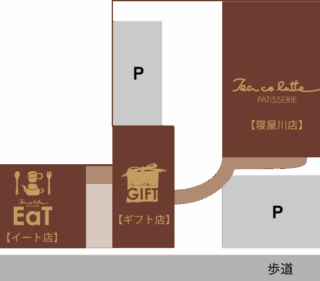 ティ・コ・ラッテ寝屋川店、GIFT店、EaT店は、3店舗が隣接しています。 それぞれの用途に合わせた店舗になっておりますのでご利用ください。 駐車スペースもございます。